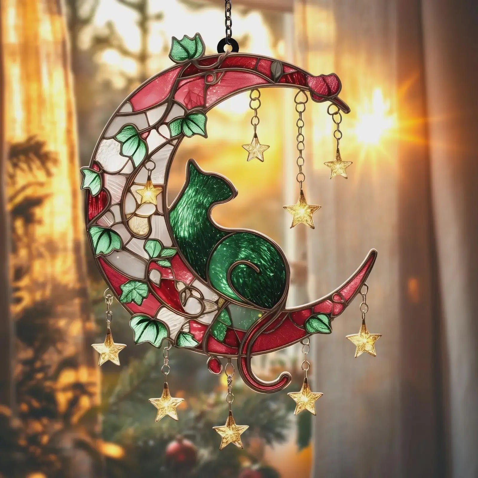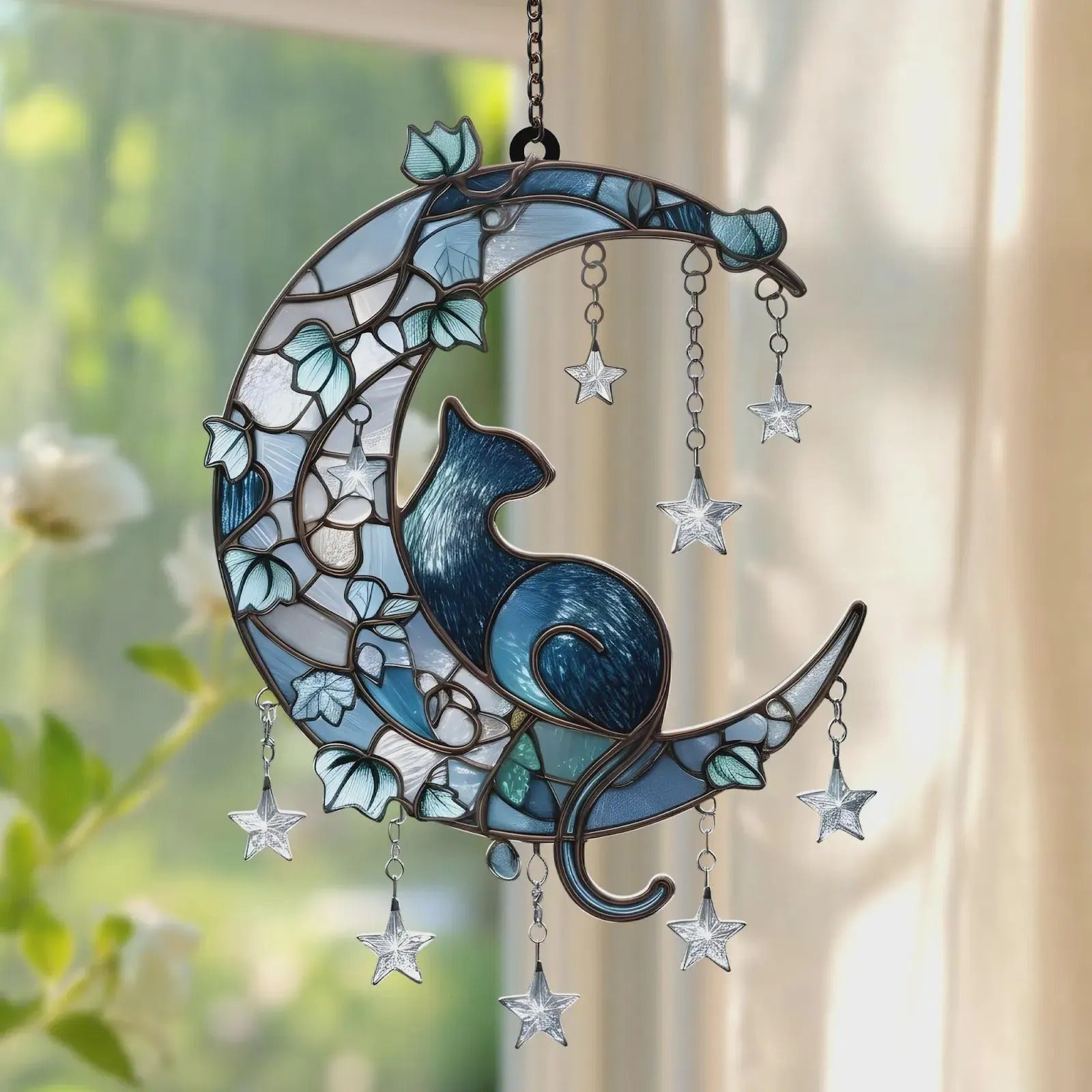 Cat on Crescent Moon Acrylic Window, Acrylic Window Hanging