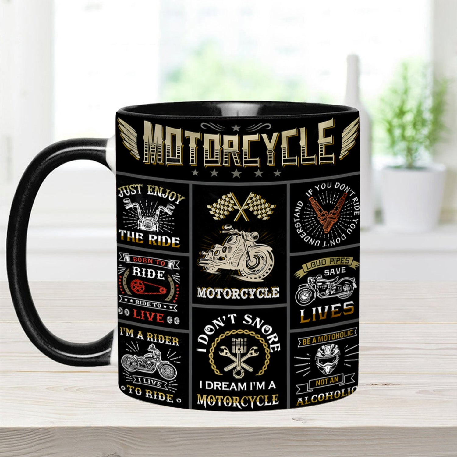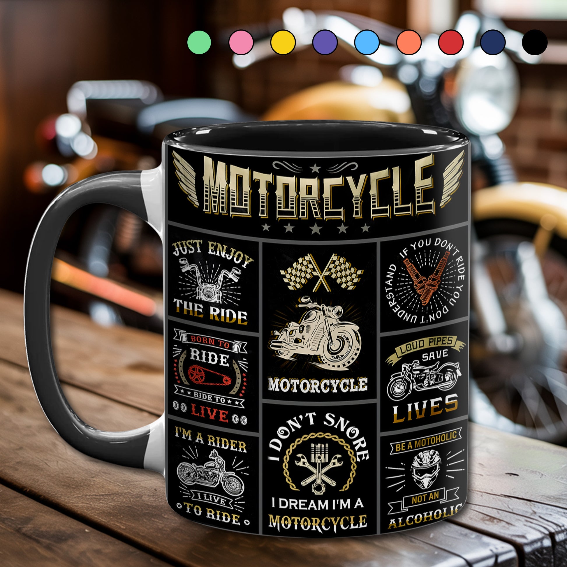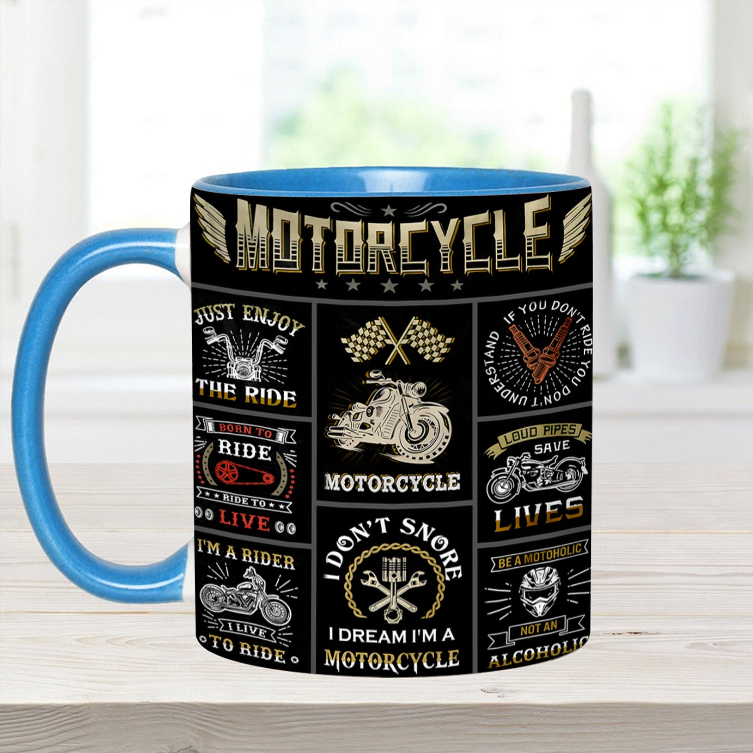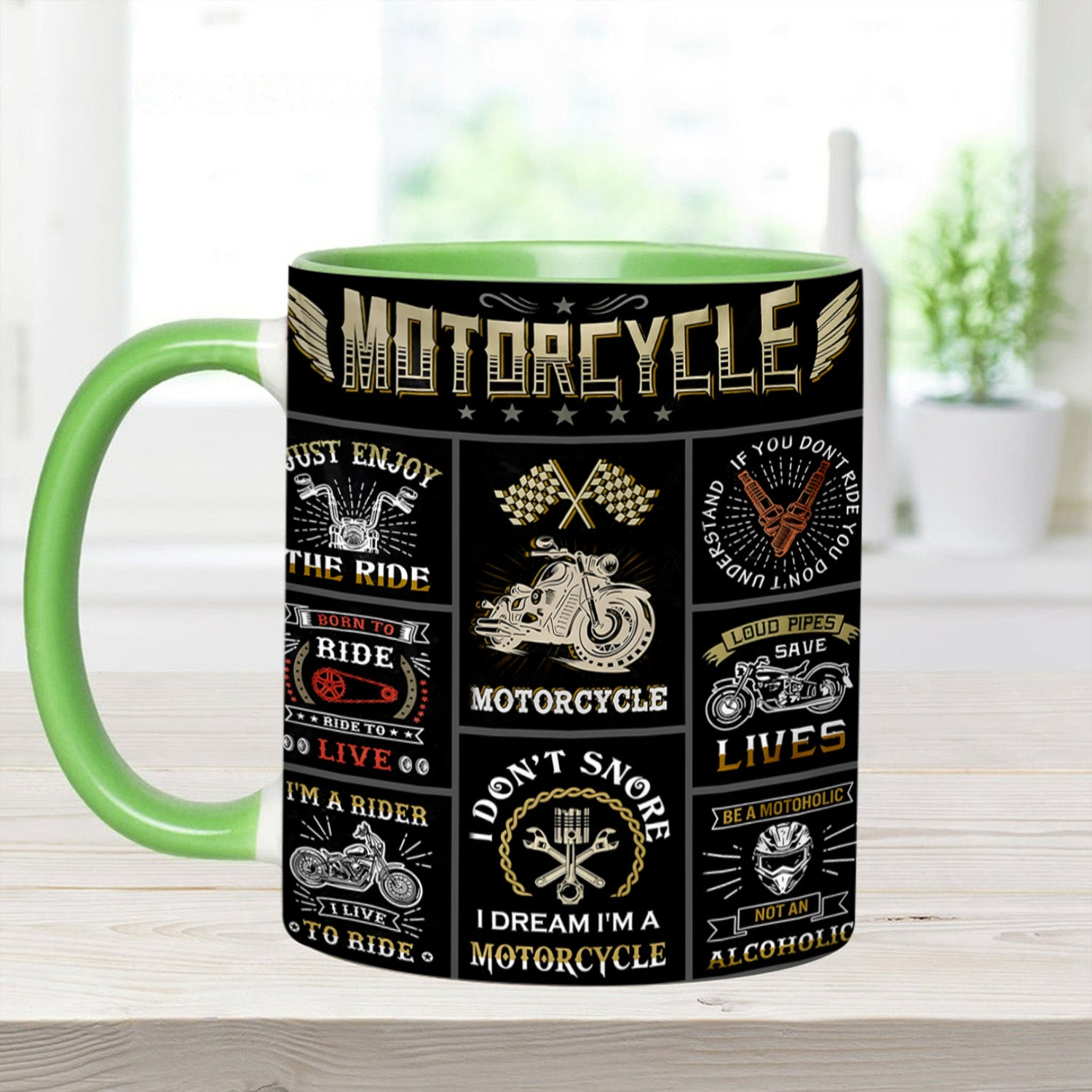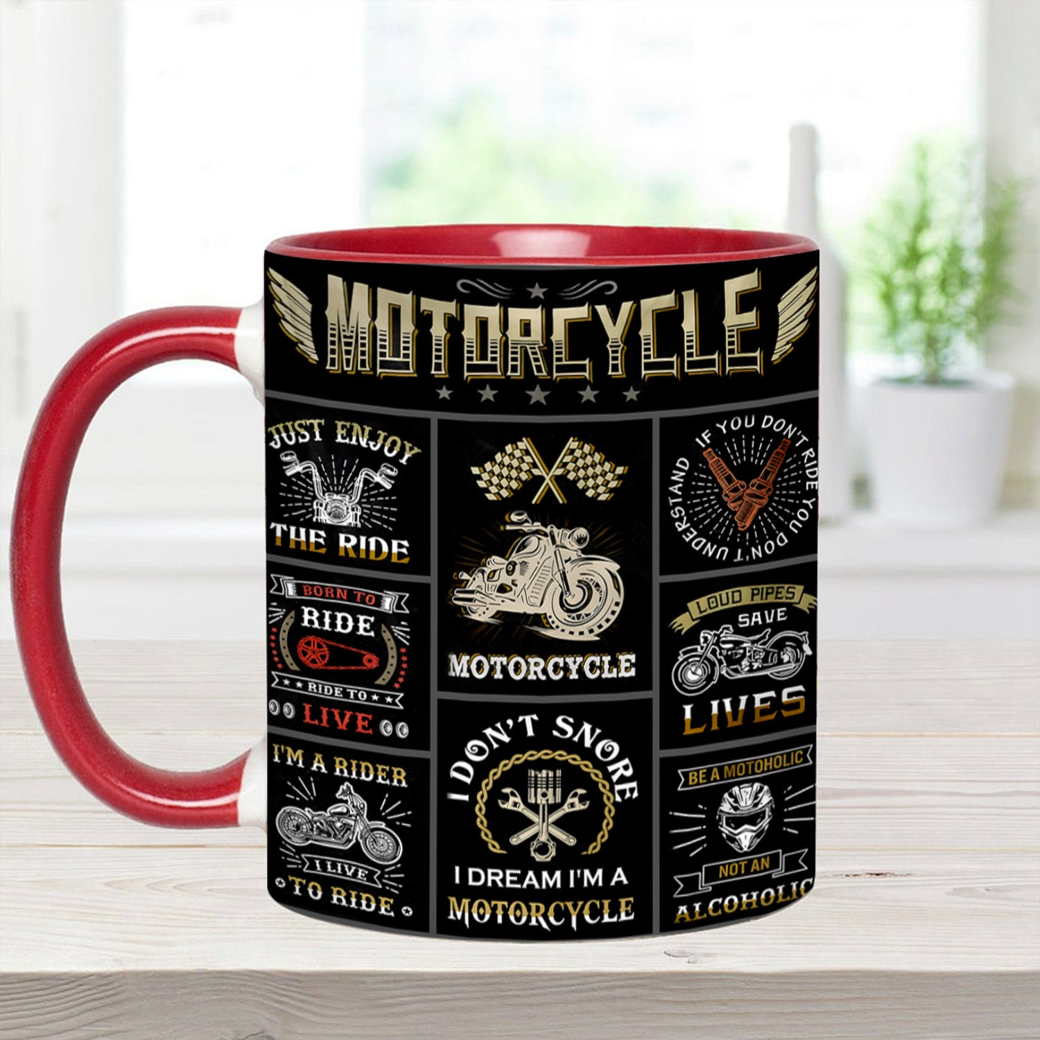 - High quality ceramic mug with two-tone rim, interior, & handle